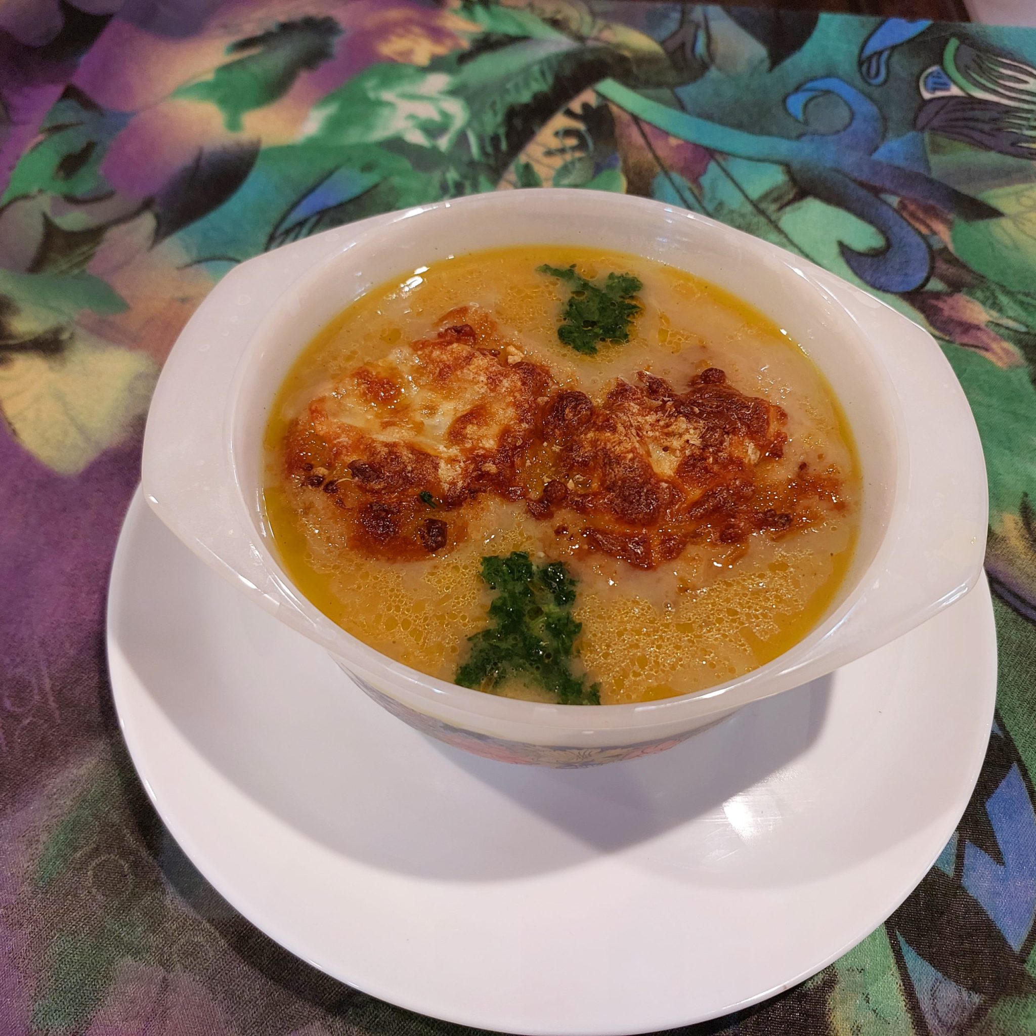 سلام خدمت استاد عزیزم. سوپ خوشمزه پیاز فرانسه همراه با نان پنیری.
