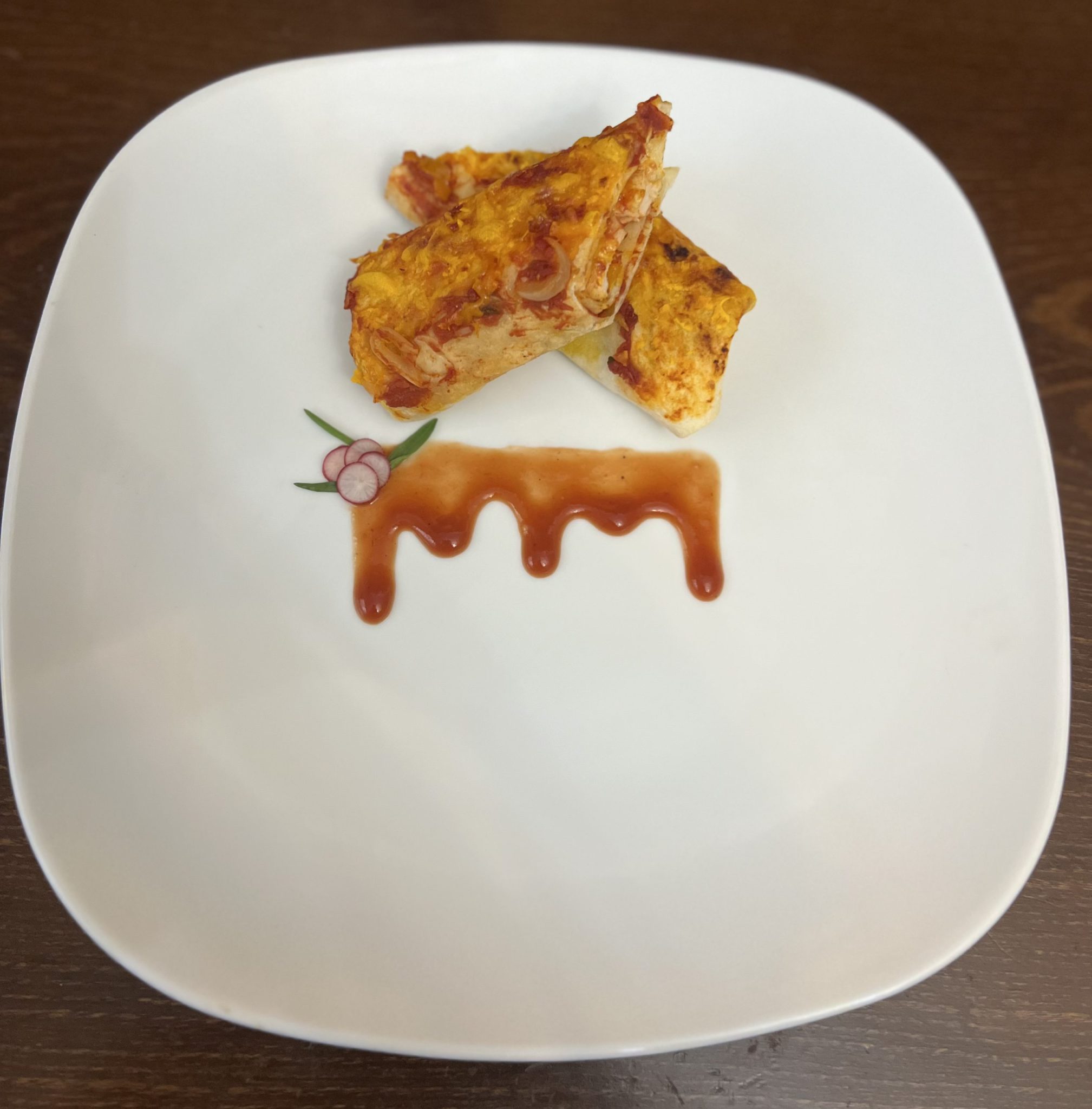 انتخاب این بشقاب برای غذای ملل کاملا اشتباه هست .و گارنیش هم برای رعایت هارمونی رنگ با بشقاب اشتباه انجام شده .لطفا اصول و استانداردهای آموزش داده شده در کلاس آشپزی ملل را رعایت کنید